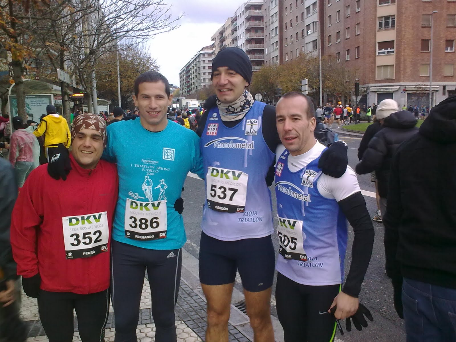 El circuito diseñado para esa edición era prácticamente llano y las idas y venidas por algunas de las calles del centro permitían vernos las caras y darnos mutuamente ánimos al cruzarnos. Hasta el km28 todos fuimos bastante bien, según lo previsto, pero a partir de ahí, que es cuando se acaban los macarrones almacenados, empiezan las miserias. Yo había comido bastante durante toda la prueba, cada 5km tomaba geles o galletas de chocolate (las Príncipe son las que más chicha me aportan) y a pesar de notar bastante pesadez en todo el cuerpo y de que las pulsaciones empezaban a cantar que algo estaba fallando, pude mantenerme bastante concentrado e intentar luchar por mi ritmo sin notar el típico muro (que ya había notado las otras dos veces que había corrido en maratón). A falta de unos 5km me alcanzó Jordi del Inferno de Alfaro y nos dimos muchos ánimos. Íbamos más o menos a por el mismo tiempo. En esa zona me cruce primero con Fernando, que iba como un tiro y luego con Jorge, bastante cerca ambos de las liebres de 3h30. Ya “sólo” restaba disfrutar de los últimos metros, apretando los dientes y olvidándose de los dolores, y así la recta de meta de Anoeta sería nuestra. Cuando sólo quedaban 2 km me adelantó la liebre de 3h15, a la que intenté pegarme pero fui incapaz. Finalmente entré en el estadio y disfruté de los 250m que se hacen sobre el tartán de la pista, viendo que el reloj todavía no marcaba el 3h16. Al llegar y para mantener mi tradición, me eché a llorar como si fuera un bebé, supongo que por la emoción de haber conseguido un reto tan trabajado. No me dio ninguna vergüenza. Algunos atletas que llegaron conmigo y a los que no conocía de nada me abrazaron, felicitándonos mutuamente de manera espontánea… yo creo que eso sólo pasa en pruebas de este tipo. Mi familia estaba esperándome y la marabunta me llevó hasta fuera del estadio sin que pudiera darme cuenta.