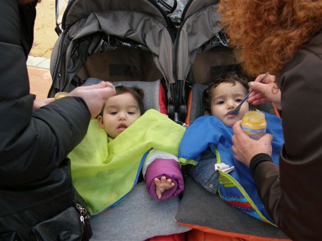 La salida fue rapidísima, creo, ya que yo salí el último por detrás de mis dos churumbeles, empujando, como siempre. Por un momento pensé que ellos no “correrían” ya que casi no les quedaba tiempo para doparse, pero gracias a la labor de la madre y la abuela que les dieron su “potito” mientras yo me colocaba el chip, llegamos a tiempo a la salida.