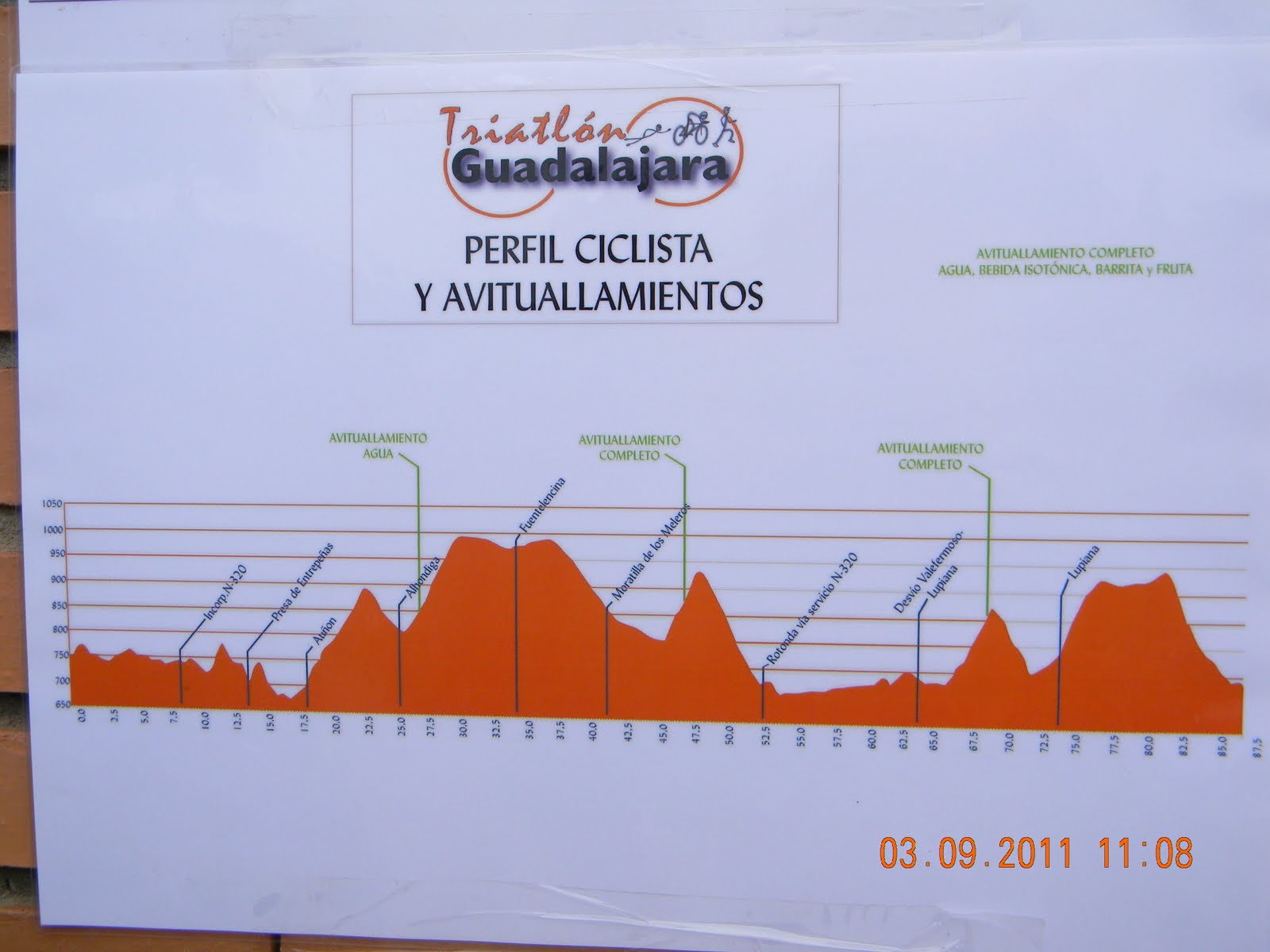 SECTOR BICI (87 Kms) el perfil tenia bastante desnivel, este sector tuvimos buen clima, aquí empece con buenas sensaciones, era una tirada de Pareja a Guadalajara: iba trascurriendo bien la prueba hasta que, a la altura del km 25, se me sale la cadena por encima del piñon más grande, iba con el plato subiendo y consigo, bajando de plato recuperar la cadena a su sitio, digo "BIEN RAUL,BIEN", claro que la carretera tenía más sorpresas; estaba resquebrajada y en tanto en cuanto estaba solventando mi primer problemilla, metí la rueda en una de estas pequeñas grietas, una vez pasado esto digo "BIEN HEMOS LIBRADO", observo como una pareja de espectadores nos estan animando, estaban parados con su bici de montaña, en lo que oigo el temible PINCHAZO, claro tras mis manifestaciones de rabia pertinentes, busco la solución rápida, esta pareja me ayuda altruistamente, mientras voy cambiando la rueda, "la bomba que si la había llevado, pero se había quedado en los boxes" intenta conseguirla la chica, pidiéndosela a los triatletas que subían, evidentemente nadie la soltaba, imagino pensando "Y SI PINCHO YO QUE....", hasta que un tio muy majo el "169" (Edu) "buen número" se la deja a mi amiga de aventura, consiguiendo, inflar la rueda y arreglar el problemilla, que luego serían (de 10 a 15 minutos más), pecata minuta, desde aquí mi agradecimiento a esta pareja "MUCHAS GRACIAS" y por supuesto al triatleta vasco 169 (Edu), al cual más tarde conseguiría alcanzar, le quise devolver la bomba, me dijo "dejamela en mi cajón" asi que yo con su bomba guardada en el tritraje. Continuamos luchando con las subidas y bajadas, sector duro. Bueno llegamos a la T-2 un campo de atletismo "Fuente de la Niña", dejo la bici en la hendidura del cajón y me pongo las zapas. Salgo a por el último sector y digo "CASPITA ME LLEVO LA BOMBA" asi que vuelvo, la dejo, y empiezo la carrera.