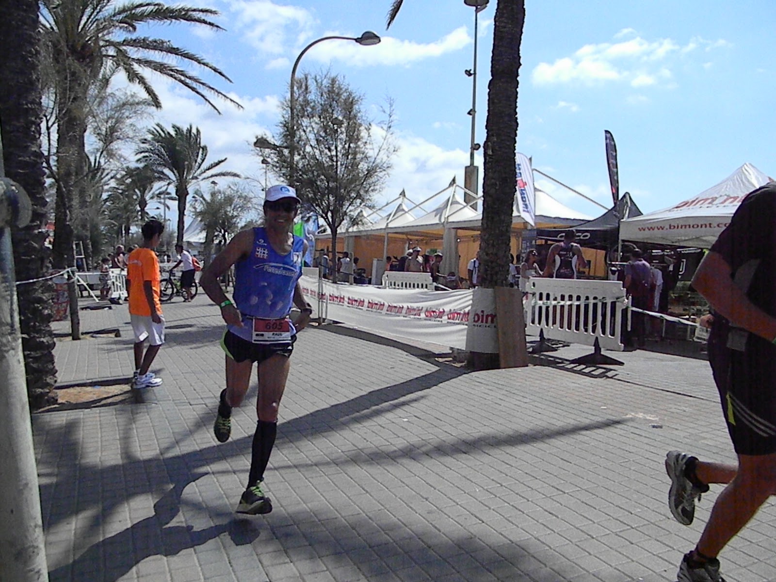 Continuaba mi última vuelta, y mi particular historia, aquí en un avituallamiento que perdí, un negrito muy majo me trajo un vaso de agua y se me cayeron las gafas, dije, "da igual que se las quede este hombre que se ha sido amable, trayéndome agua", continuaba y mi estomago volvió ha hablarme en forma de flato en un principio en un lado, luego en otro y finalmente en ambos, reduje un poco el rítmo y con algún ejercicio en carrera conseguí deshacerme de este malestar. Cada vez estaba más cerca la meta, llego al cono cerca de la catedral y digo "venga ya estamos, si hago 55  minutos entró en menos de 11horas", pero las piernas aunque parezca que van,  ya no van como antes, a falta de unos 7kms veo una pareja, uno con tritraje, agarraditos de la mano veo en su muñeca la pulserita de terminar la primera vuelta, parecían una pareja de enamorados, y resulta que es un competidor me dejo un poco descolocado, yo seguía y empiezo a oir unos pasos detrás mio, llega a mi altura y charlo con él, era veterano II, corremos un rato juntos hasta el último avituallamiento, que cojo un vaso de agua y después de un sorbo me riego la cabeza, en ese momento tiraba un poco de viento y hacía un poco más de frío, así que me pega  un viaje al estomago, que me toca otra vez reducir ritmo y sujetar mi barriga, mi compañero provisional de viaje veo como se va a la vez que una cuesta se aproxima. Esta se hace bastante dura, aun así la hago corriendo,  cada vez estaba más cerca, paso el barrio llamado Can Pastilla, el cual daba a la playa de Palma, con sus balnearios (cafeterías al lado del mar, quince en total), contando los balnearios  voy a por la meta, yo estaba en el quince y la meta estaba en el 10, así que con mi dolor estomacal y mi amigo Miguel dándome ánimos sin parar, contándome historias para hacerme olvidar el sufrimiento, aprieto los dientes y cierro los ojos, aumentando mi ritmo, pasando  balnearios interminables (15-14-13-12-11), en el número 10 por fin veo el deseado arco de meta, llego MUY CONTENTO, he conseguido terminar soy como la camiseta y la medalla  que me entregan dice "FINISHER", la medalla en forma de pera, muy grande pesaba un montón, pero es agradable.