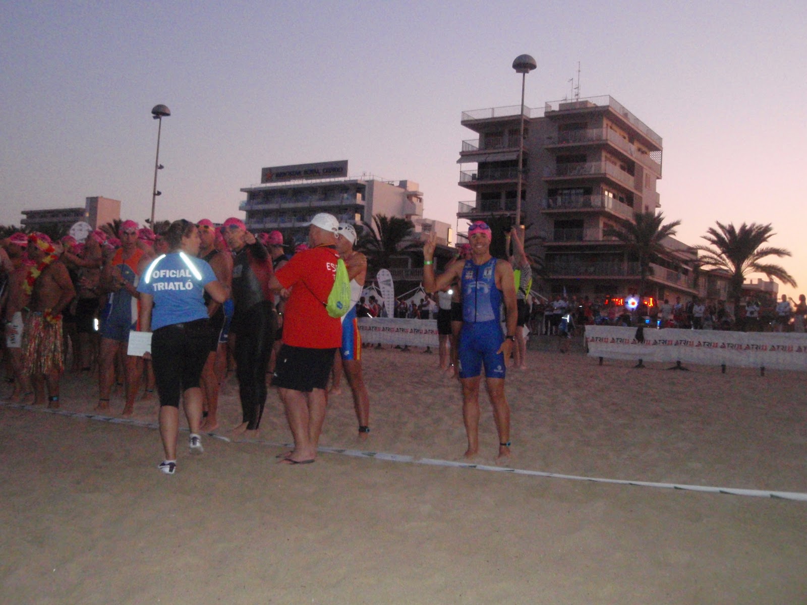 El día D (la prueba), nos trasladamos en el coche hasta el punto de salida y dejo los botes con bebida , observando el lugar de la barra donde se encuentra mi bici, era de noche y hacía mucho frío, así que me puse a correr ya que me retenblaba entero, el sector de agua era sin neopreno, salvo para los mayores de 50 años. Medio sobao y con pereza caliento un poco en el agua, donde se estaba mejor que fuera, comentamos con los compañeros como era el recorrido pues era de noche y las boyas no se veían. Uno de los compañeros iba vestido de Hawaiano, me hace gracía y nos hacemos varias fotos juntos. Nos llaman para que nos situemos detrás de la linea de salida, colocándose primero los profesionales y después el resto, saldriamos al final sobre las 07:18 horas , eso si el sol había despertado, y ya se veía.