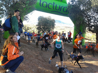 La salida fue una locura, todos los perros como querían ir los primeros, algún corredor por el suelo, se cruzaban las líneas de tiro, se cabreaban los perros…..y algunos dueños; pero supongo que esto es lo habitual en este tipo de carreras. En ese aspecto menos mal que el número de participantes no era muy elevado, unos 50. Pero a los cien metros más o menos, ya cada uno coge su sitio y se empieza a disfrutar de la carrera.